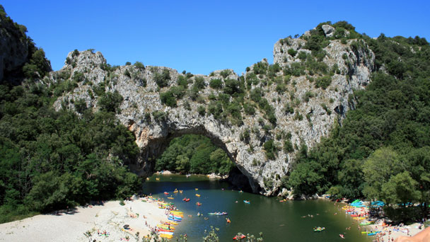 Après le passage sous le Pont d'Arc, arche naturelle de 60 mètres de haut, vous entrez dans un magnifique canyon creusé au fil du temps par l'Ardèche bordée de falaises.